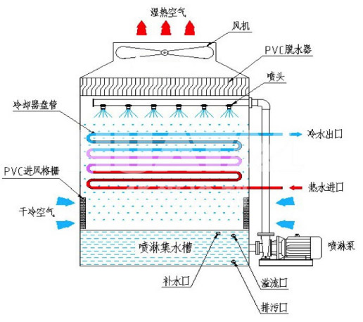工作流體(純水或其它液體)在閉式冷卻塔的盤管中循環,工作流體的熱量經過盤管散入流過盤管的水中,同時機組外的空氣從盤管底部側面上的進風格柵進入,與水的流動方向逆向,逆向流經盤管,一小部分水蒸發而吸走熱量,熱濕空氣由冷卻塔頂部的排風機排到大氣中;其余的水則落入底部水槽中,由水泵再循環至水分布系統又淋回到盤管上。